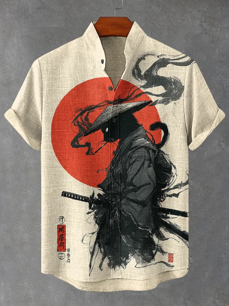 Men's Japanese Samurai Cat Print Short Sleeve Shirt