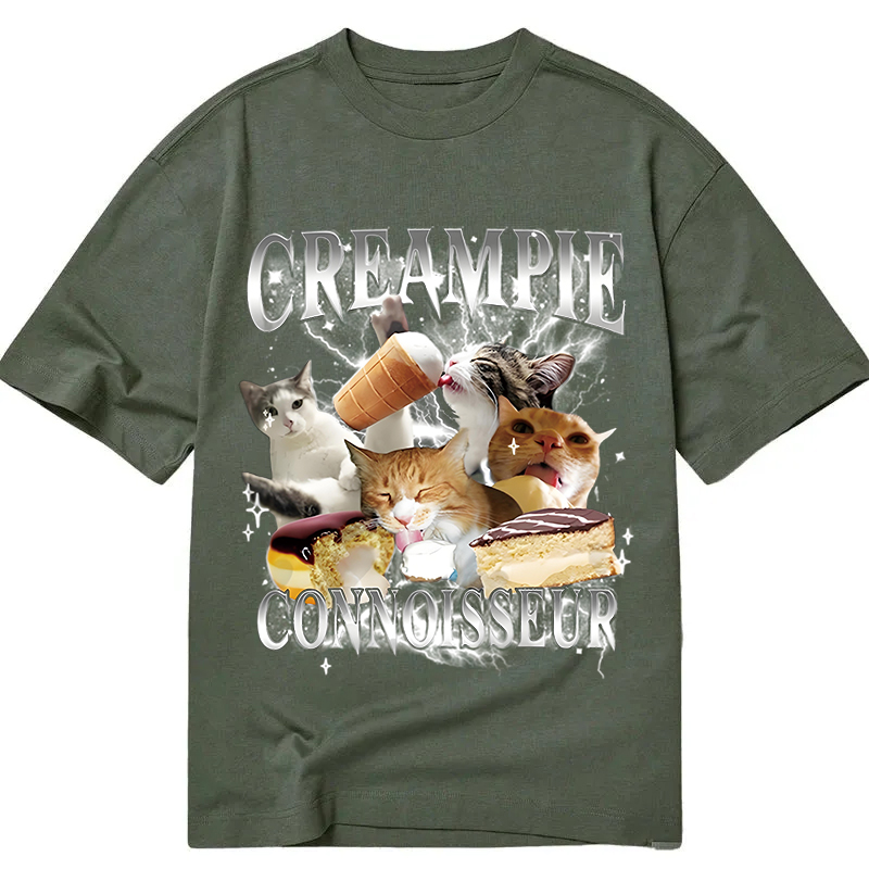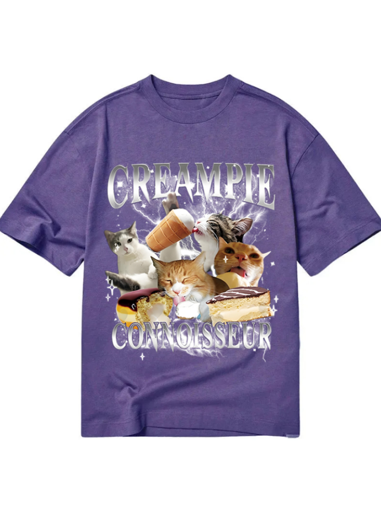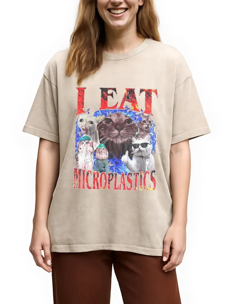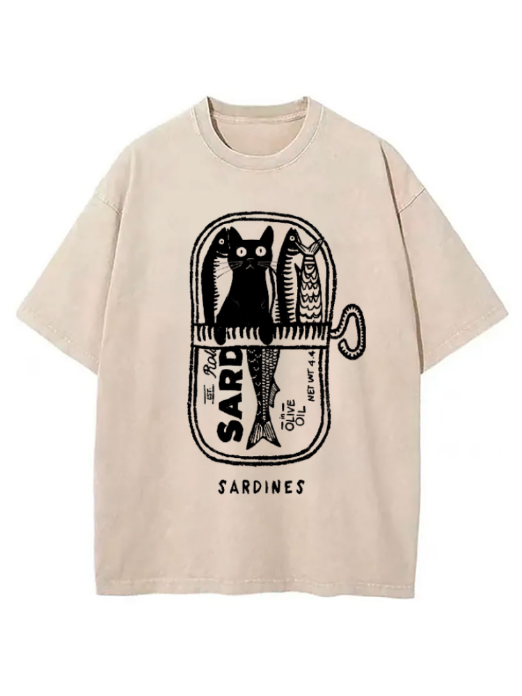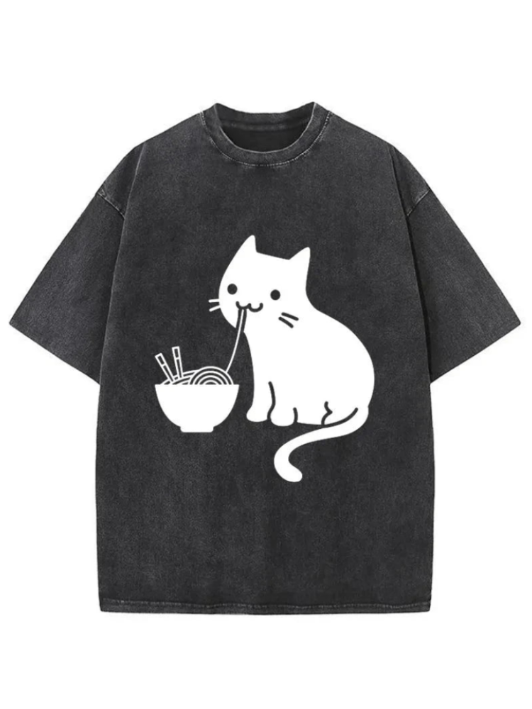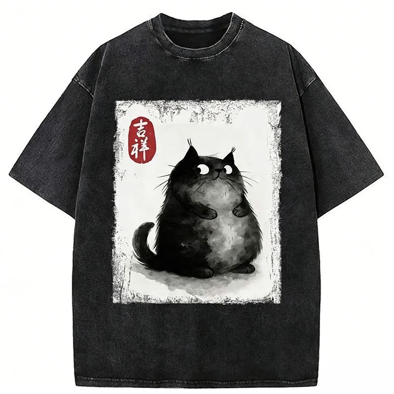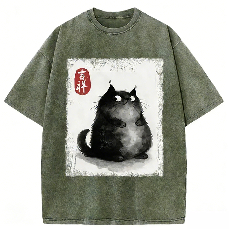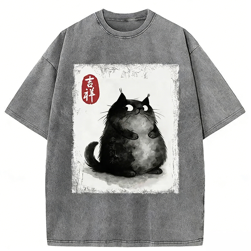 Auspicious Fluffy Black Cat Ink Painting Washed T-shirt
