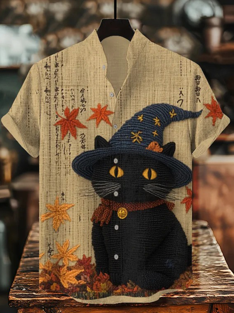Men's Japanese Maple Leaf And Black Cat Art Print Casual Shirt