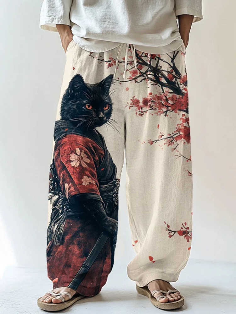 Men's Black Cat Samurai Japanese Art Print Casual Pants
