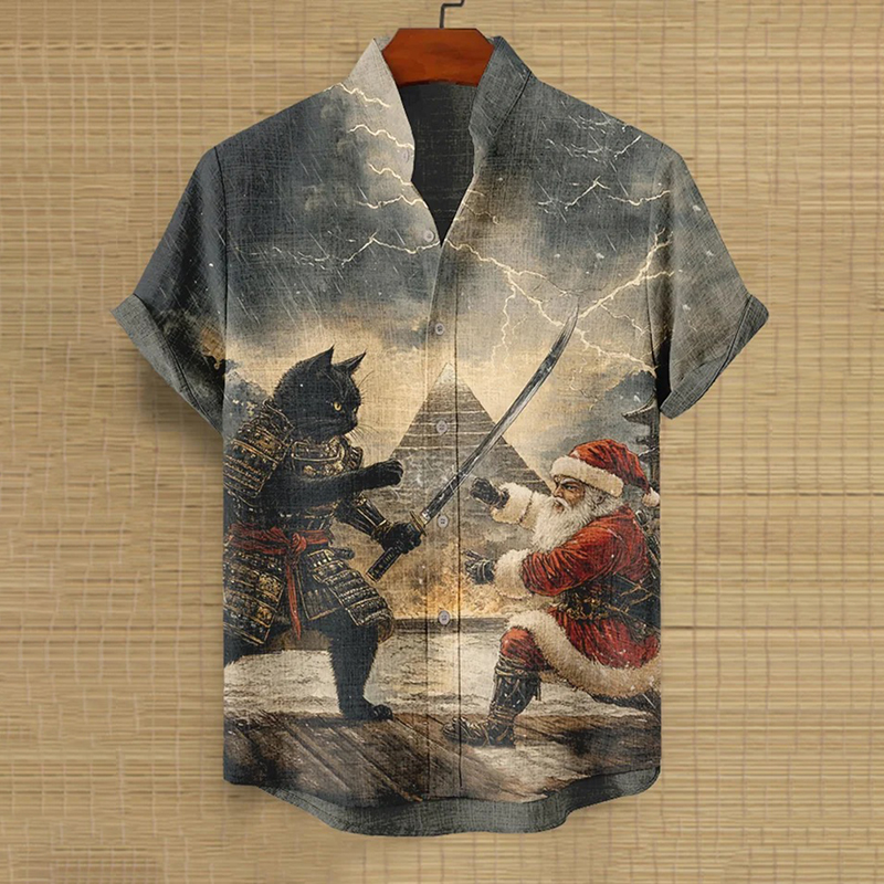 Men's Japanese Warrior Black Cat And Santa Print Shirt