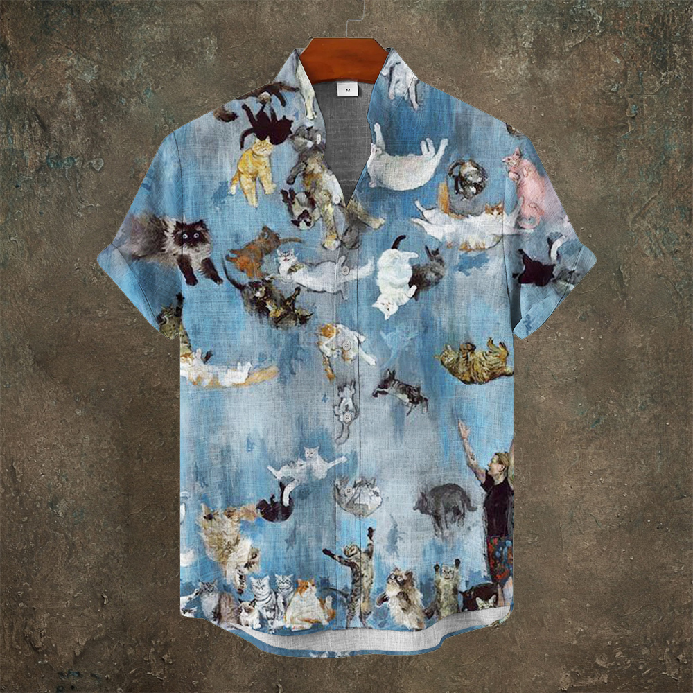 Vintage Oil Painting Cat Art Men's Linen Short Sleeve Shirt
