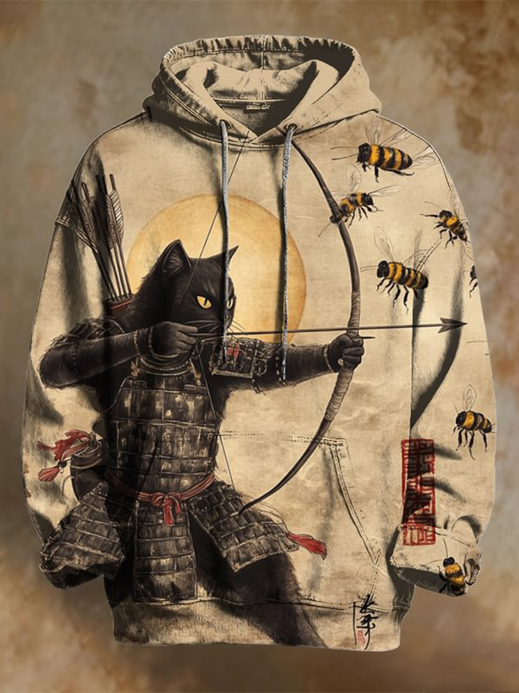 Men's Samurai Cat Fights Against Bees Japanese Art Print Casual Hoodie