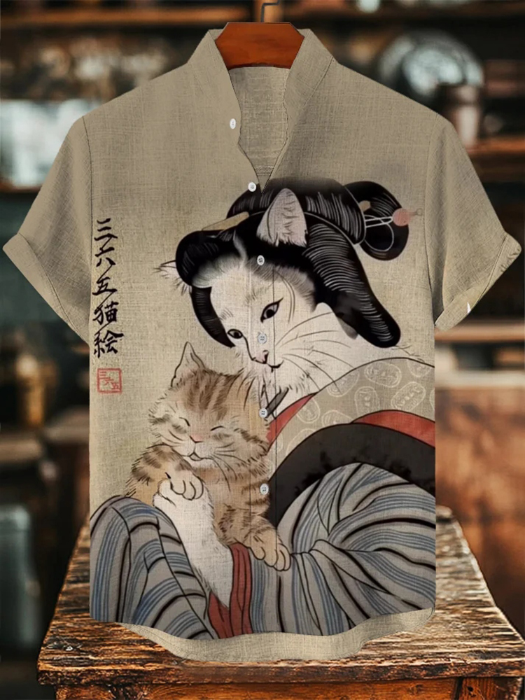 Men's Japanese Cat Geisha Art Print Short Sleeve Shirt