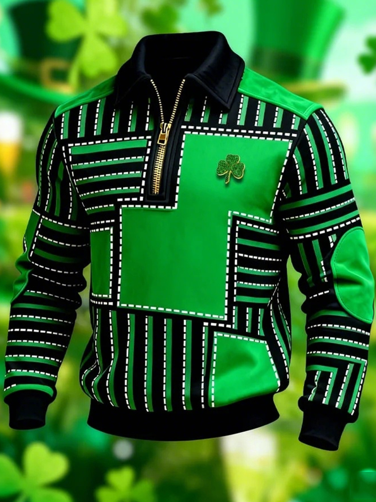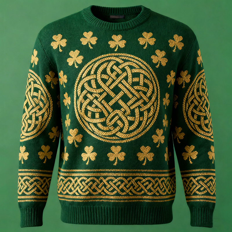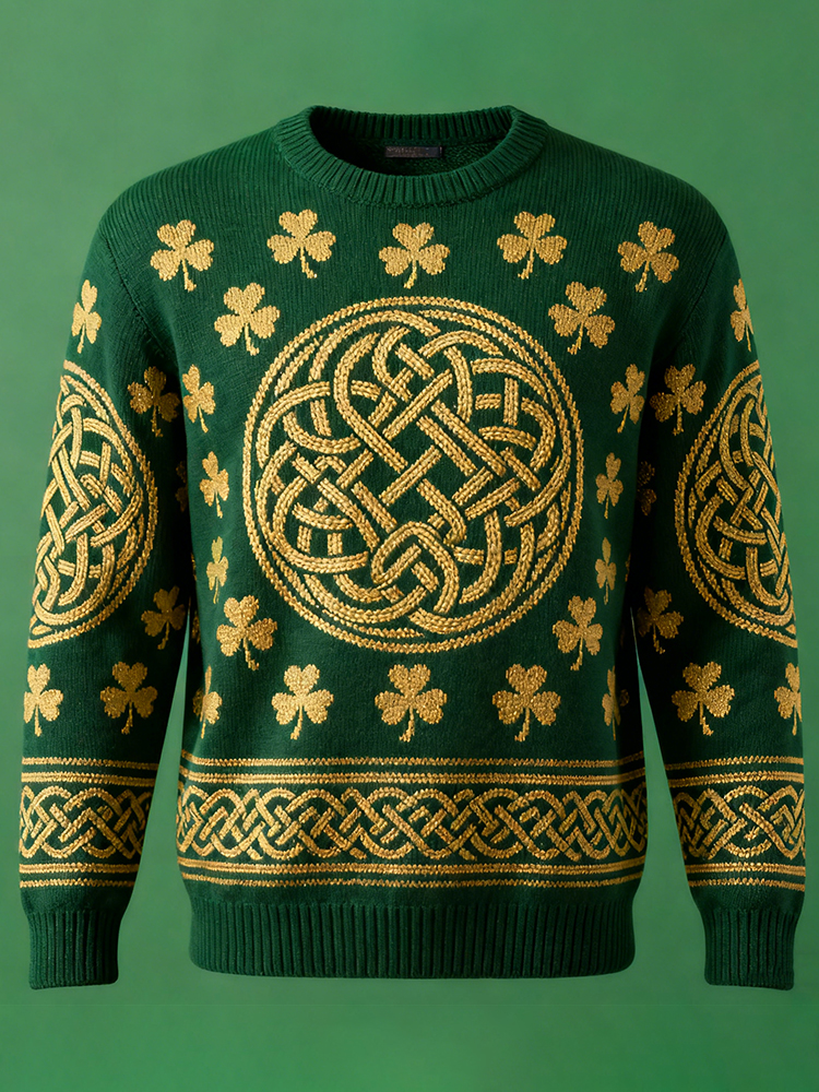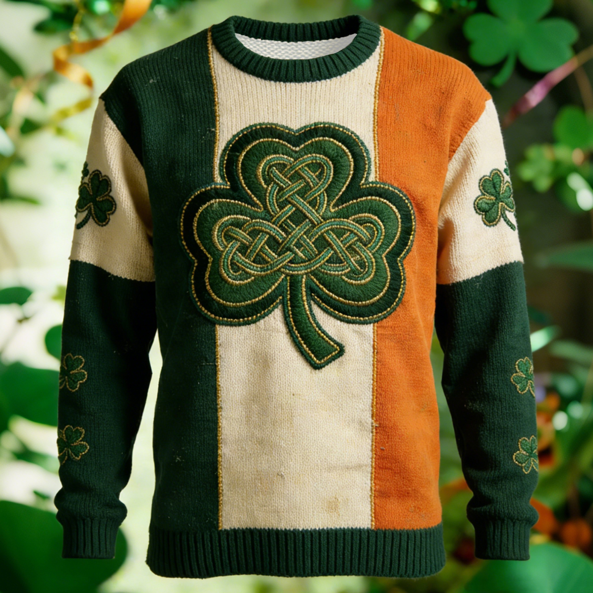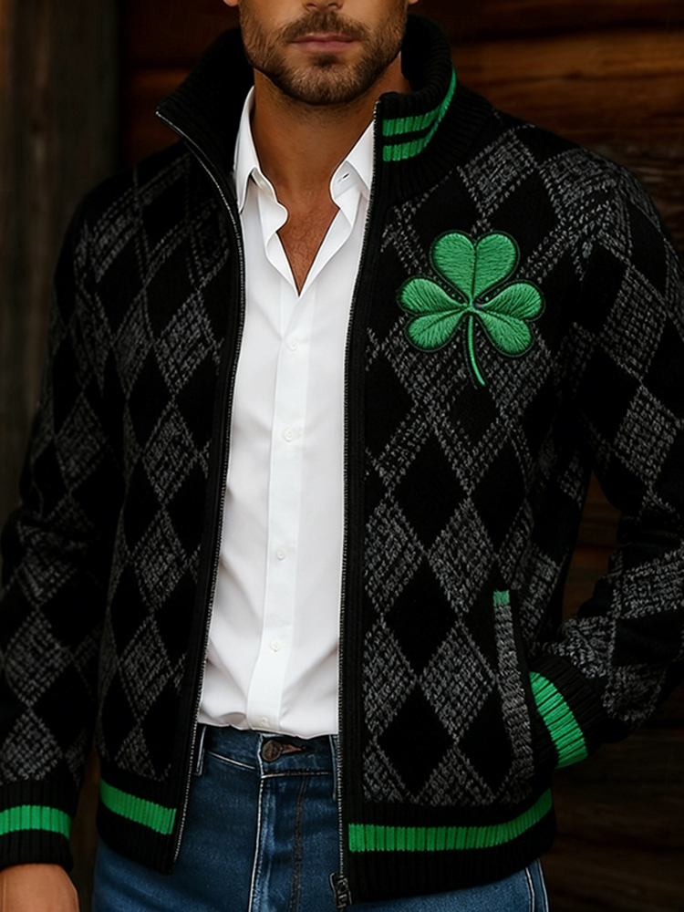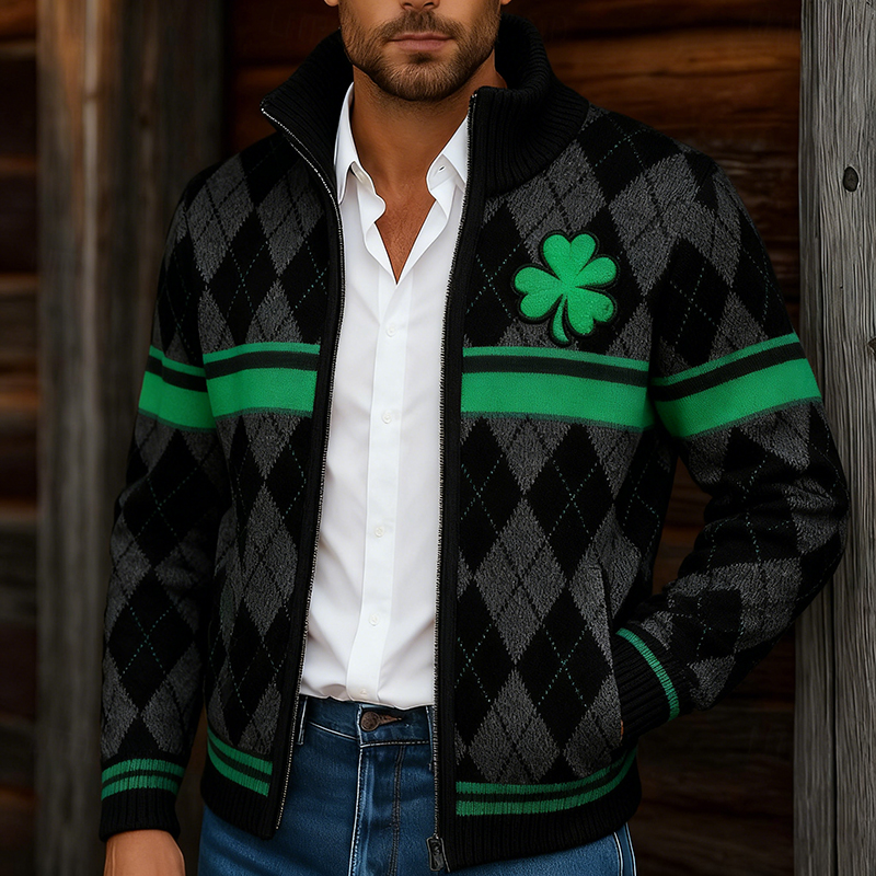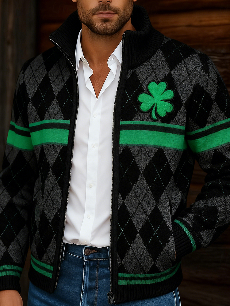 Men's St Patrick's Day Shamrock With Diamond Pattern Art Cozy Knitted Gentleman Full Zip Cardigan