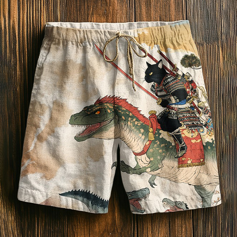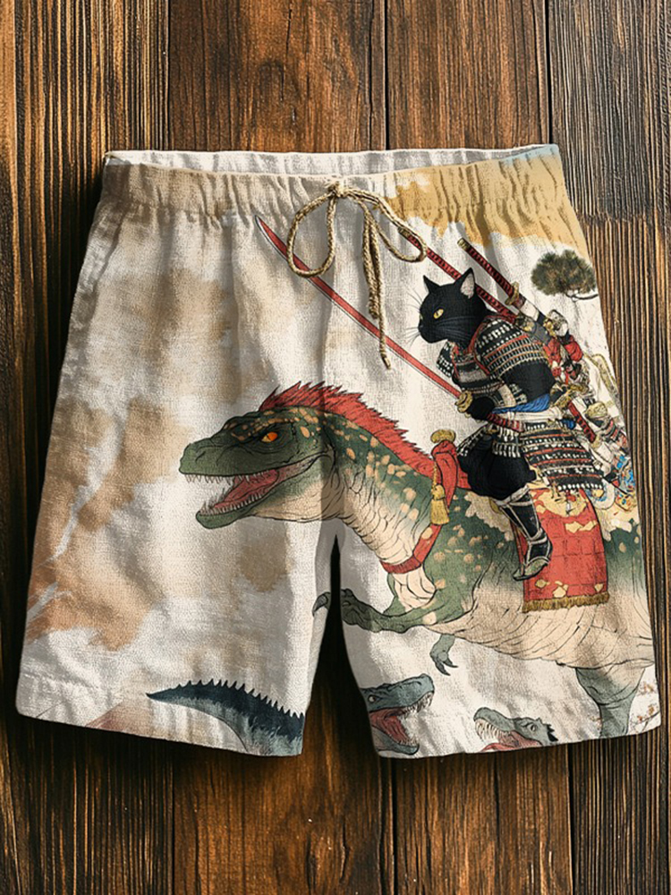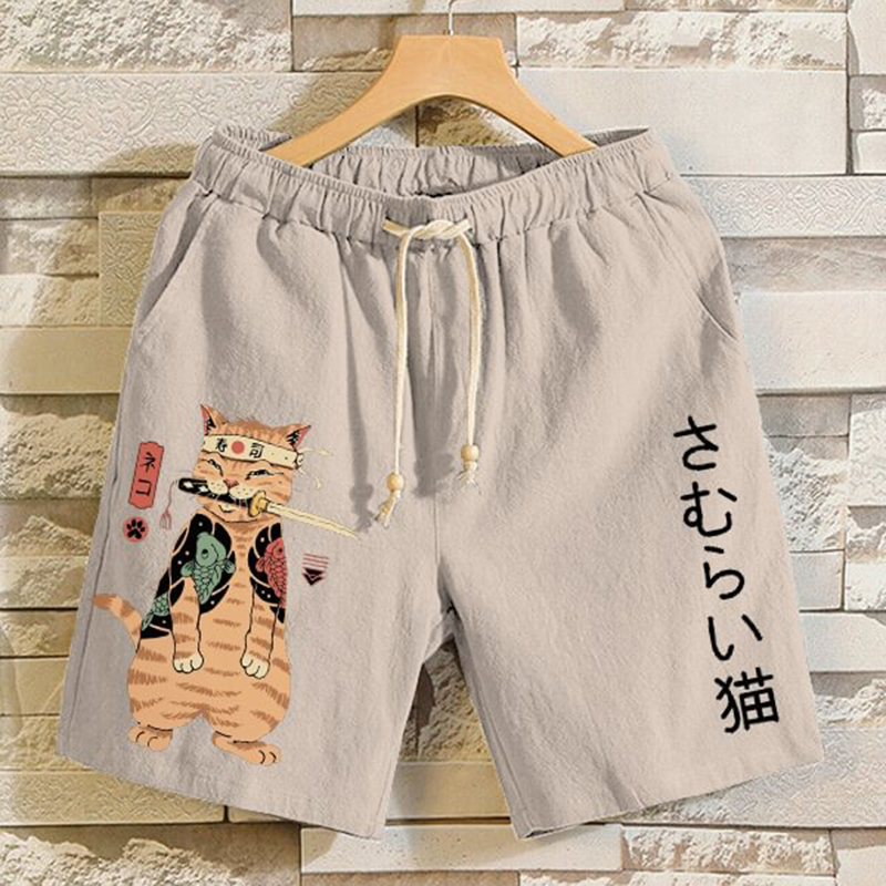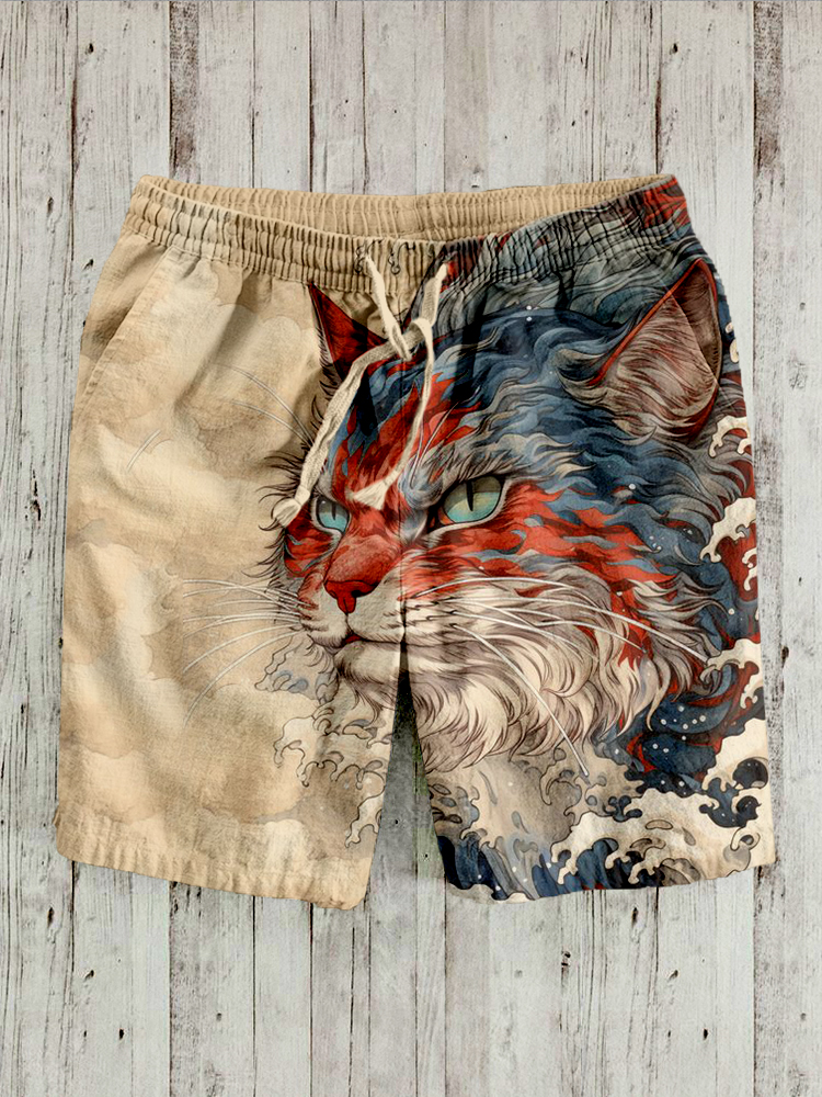Japanese Wave Inspired Mysterious Cat Art Linen Blend Shorts