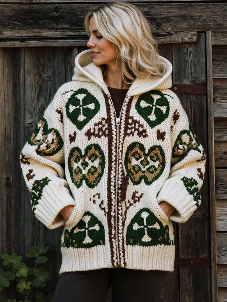 Women's Vintage Knit Jacquard Zipper Pocket Hoodie Cardigan