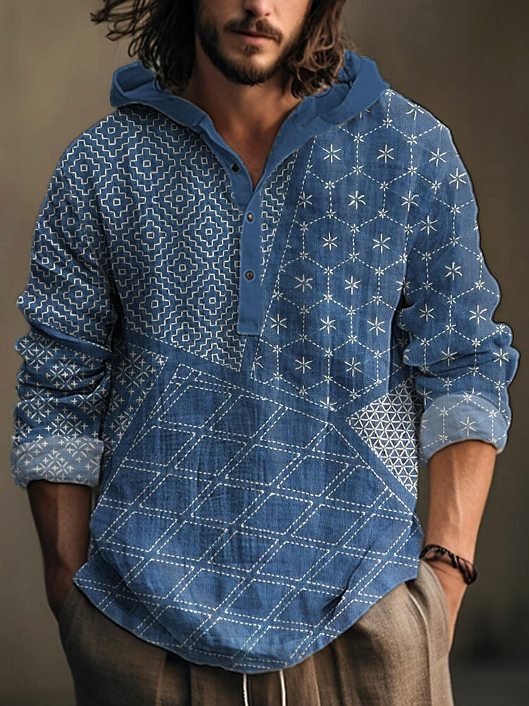 Japanese Sashiko Art Linen Blend Hooded Shirt