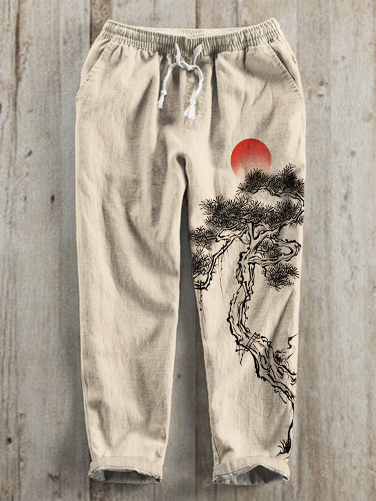 Ink and Pine Japanese Art Print Linen Drawstring Trousers