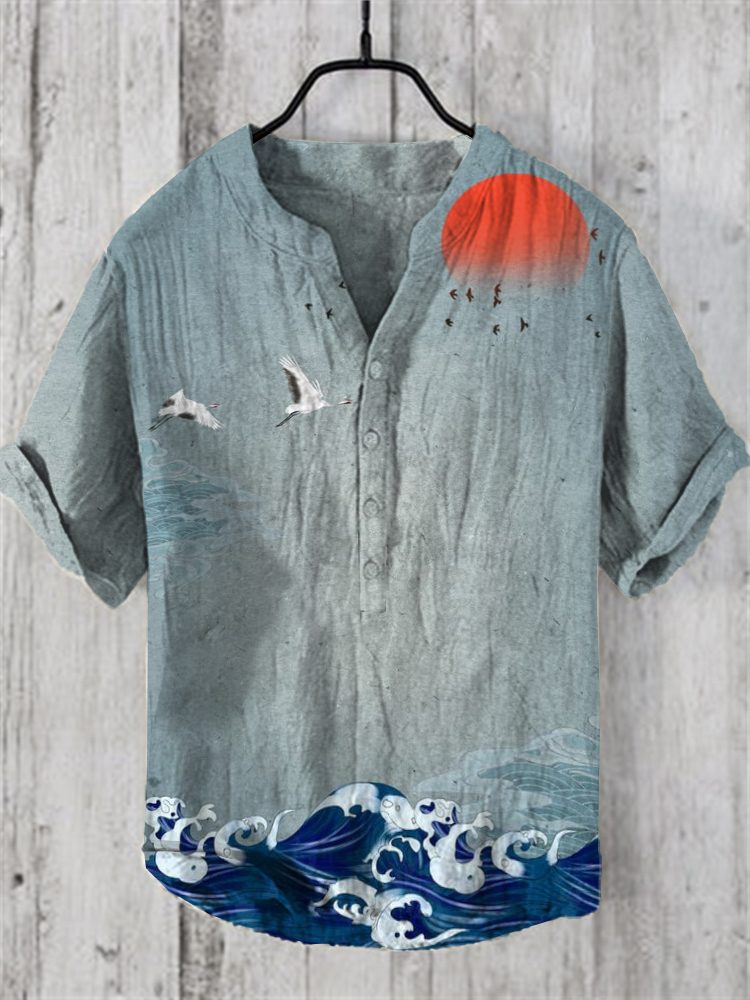 Men's Vintage Japanese Art V Neck Casual Linen Blend Shirt