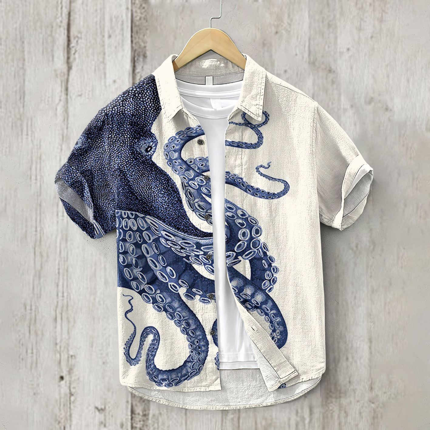 Japanese Art Octopus Print Lapel Short Sleeve Shirt