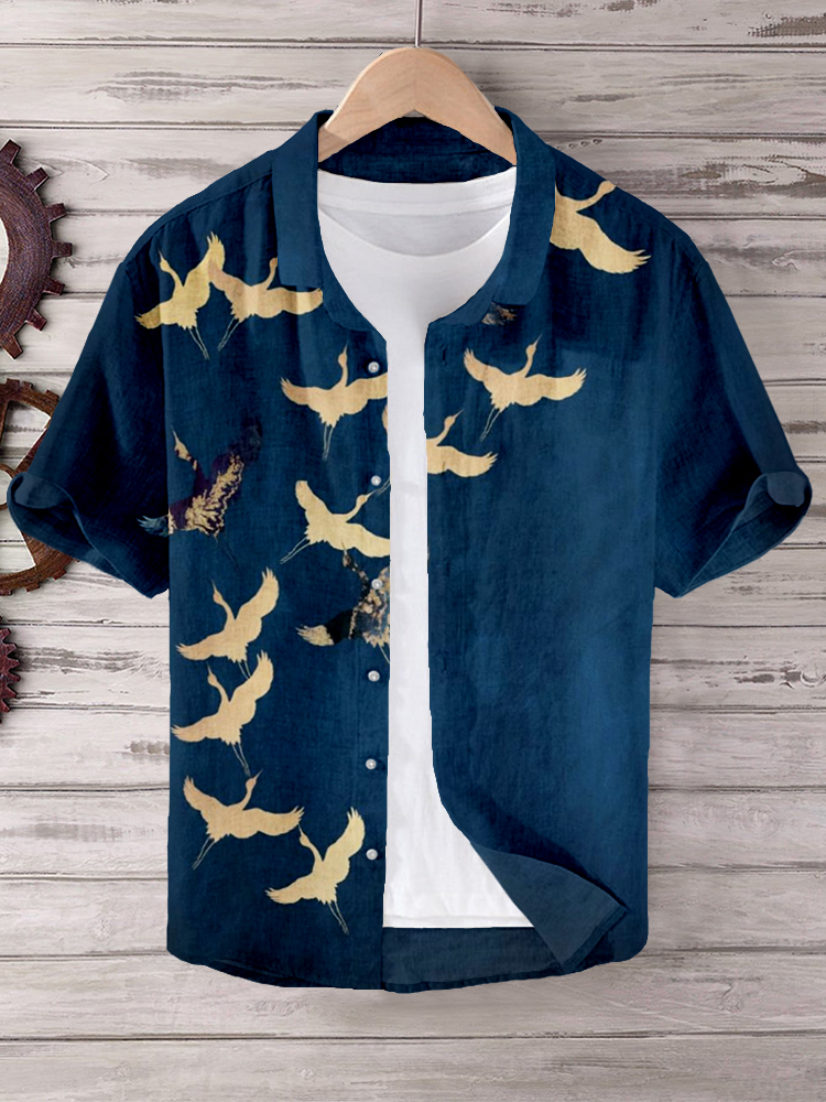 Japanese Crane Formation Pattern Linen Blend Shirt