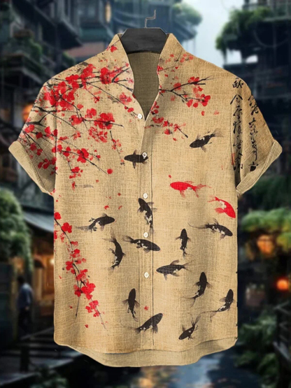 Men's Flower Fish Japanese Calligraphy Art Print Casual Shirt