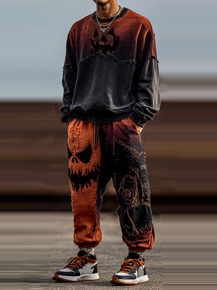 Men's Halloween Pumpkin Face Inspired Crew Neck Sweatshirt And Sweatpants Co-ord