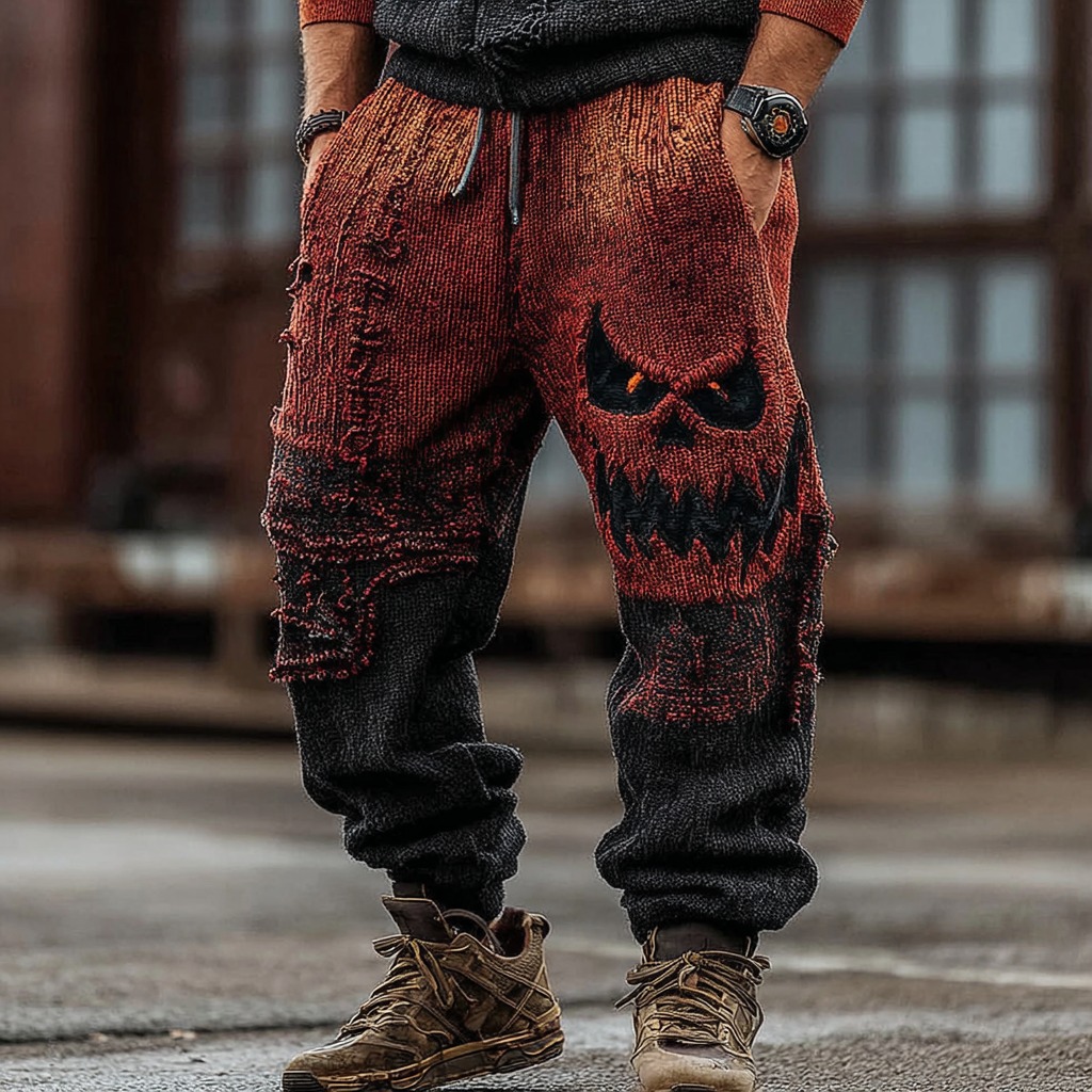Men's Halloween Spooky Face Gradient Inspired Knitted Distressed Knit Casual Long Pants