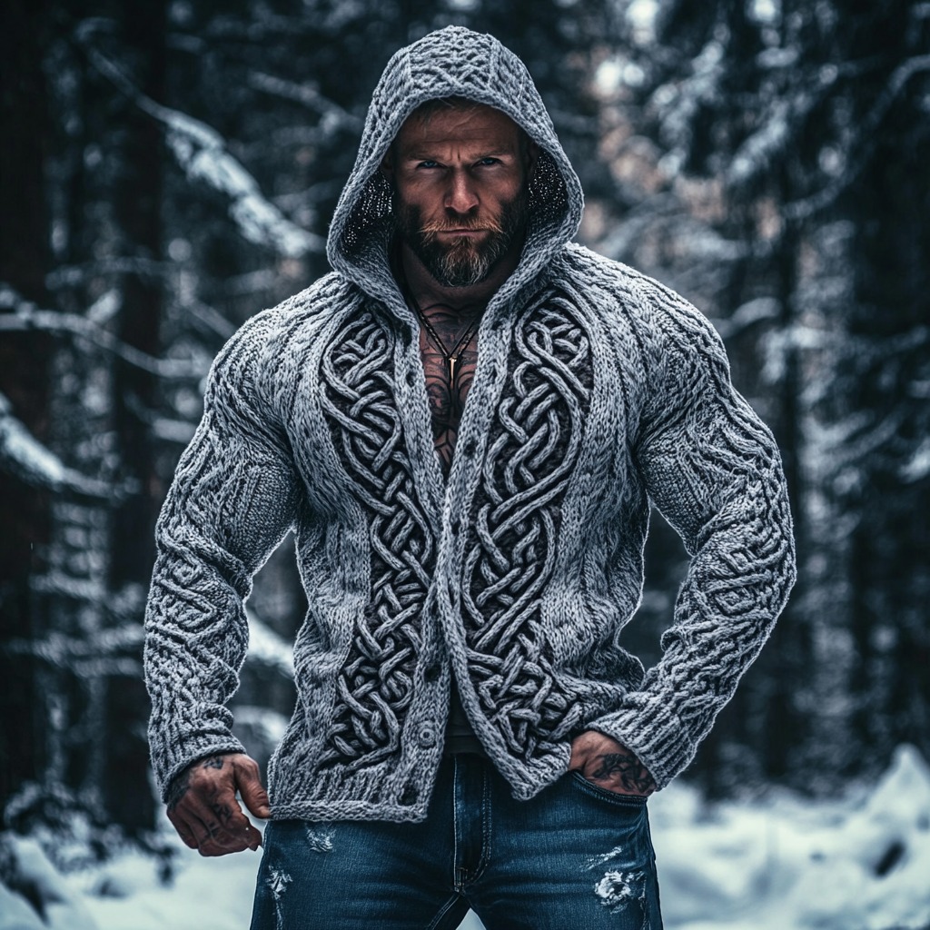 Men's Viking Celtic Mythology Chunky Knit Buttons Hooded Sweater