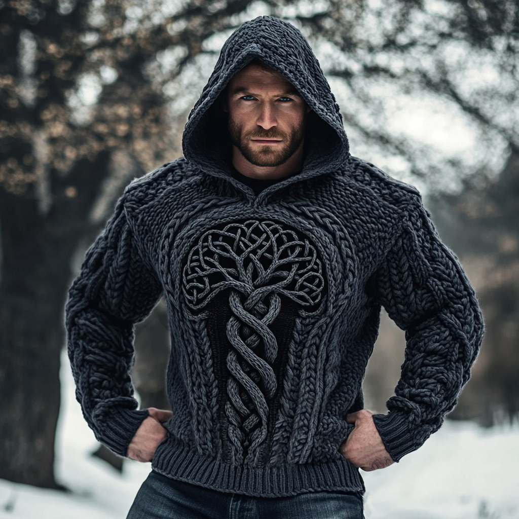 Men's Viking Tribal Tree Of Life Celtic Chunky Cozy Knit Hooded Sweater