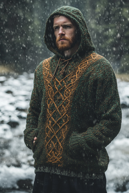 Men's Vintage Irish Celtic Knot Jacquard Mottled Hooded Sweater
