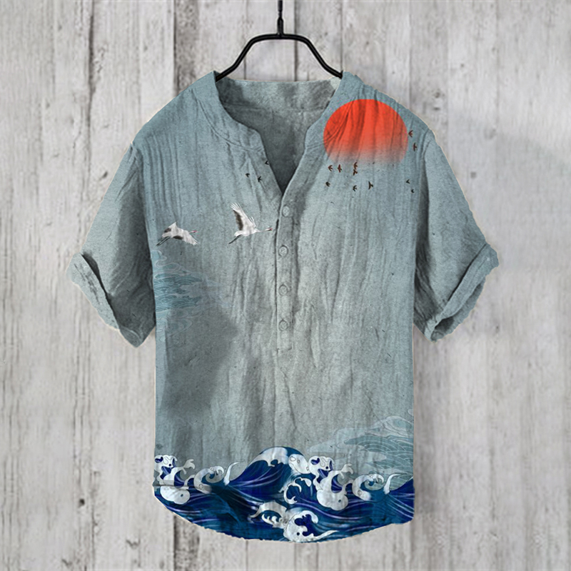 Men's Vintage Japanese Art V Neck Casual Linen Blend Shirt