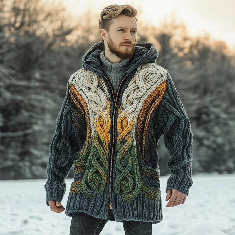 Celtic Knot Gradient Chunky Knit Pattern Men's Zipper Hooded Sweater