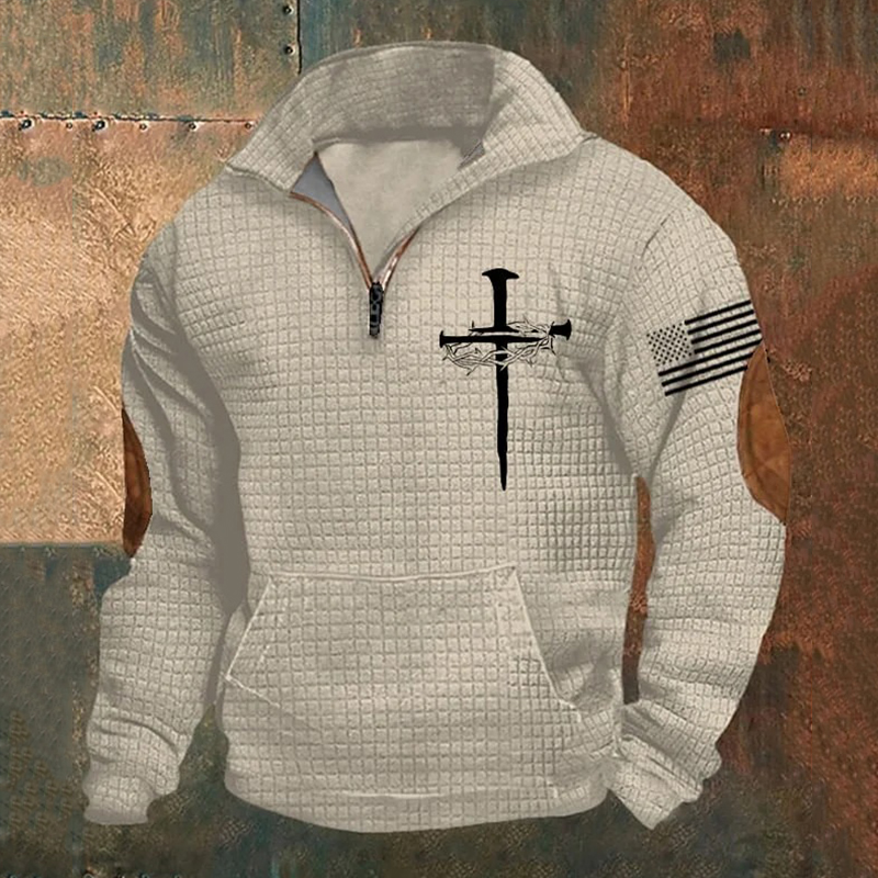 Men's Casual Vintage Art Cross Faith Zipper Checkered Sweatshirt