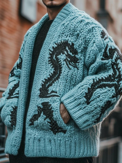 Men'S Dragon Pattern Design Thick Knitted Cardigan Sweater