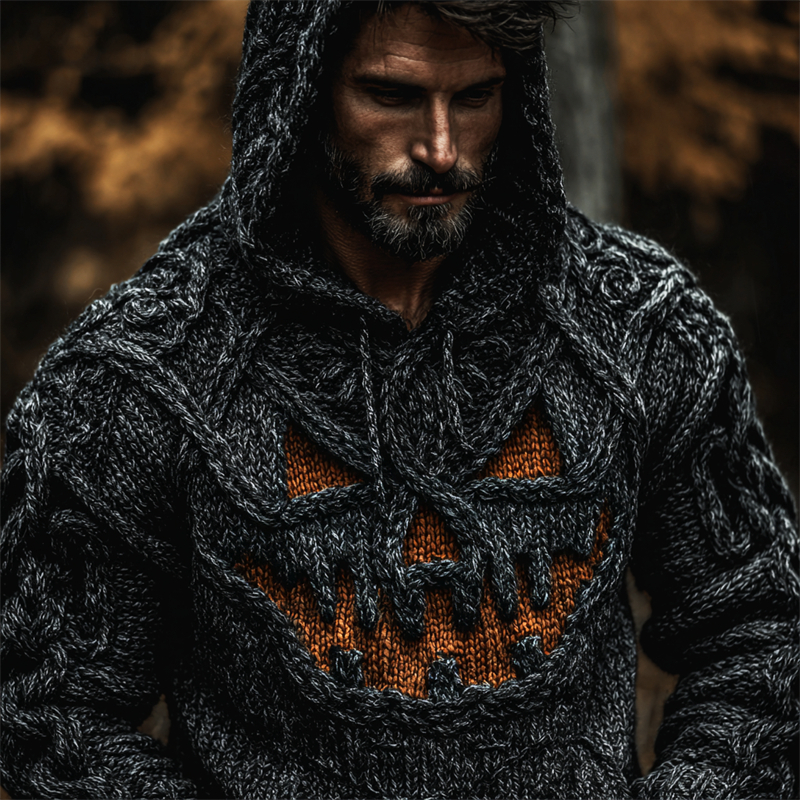 Men's Halloween Pumpkin Face Viking Celtic Cozy Knit Hooded Sweater