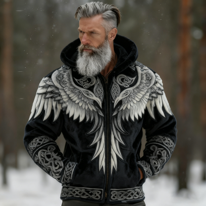 Men's Viking Tribal Jacquard Celtic With Wings Inspired Art Plush Warm Zipped Hooded Jacket