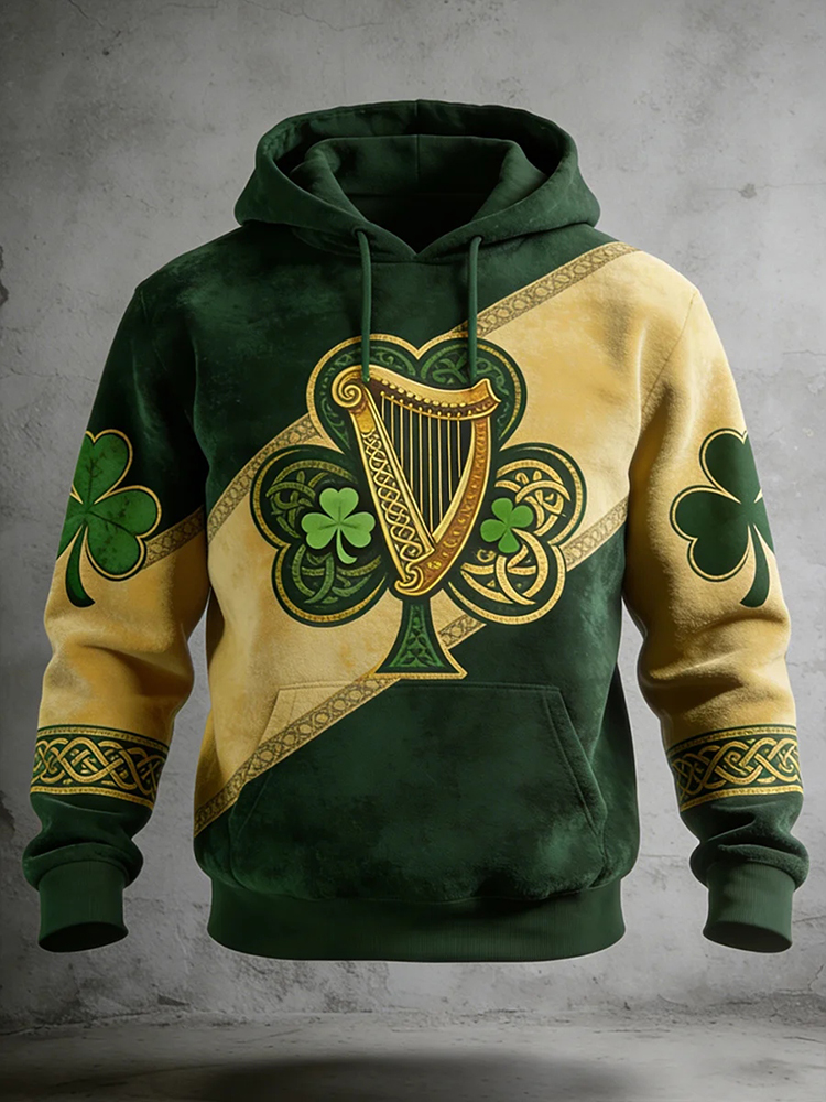 Vintage St. Patrick's Day Celtic Harp Trefoil Print Casual Hoodie