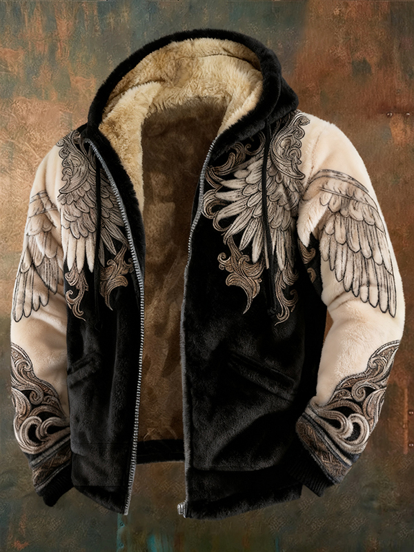 Men's Retro Celtic Knot And Wing Pattern Plush Zip-up Jacket