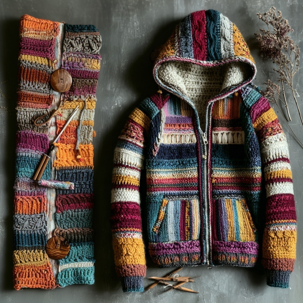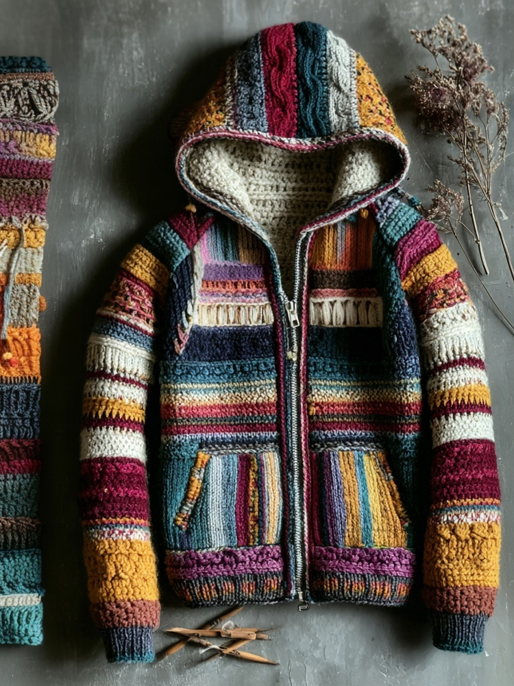 Men's Retro Geometric Patchwork Chunky Hooded Cardigan