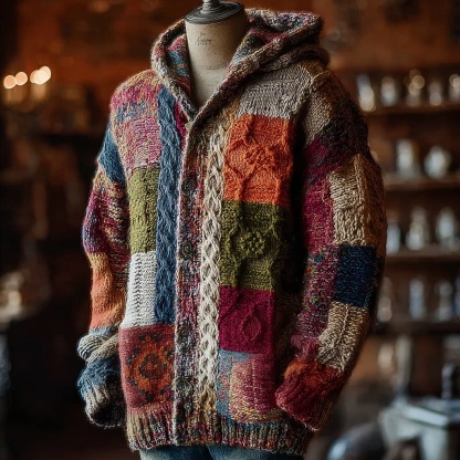 Men's Retro Geometric Patchwork Cozy Hooded Cardigan