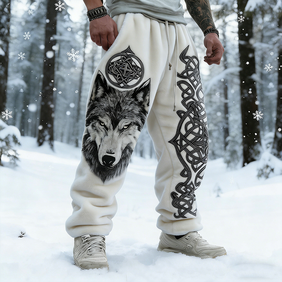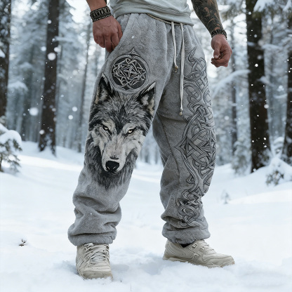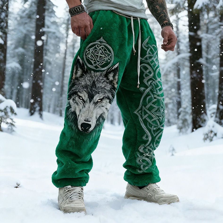 Men's Retro Viking Style Wolf Head Print Flannel Long Pants