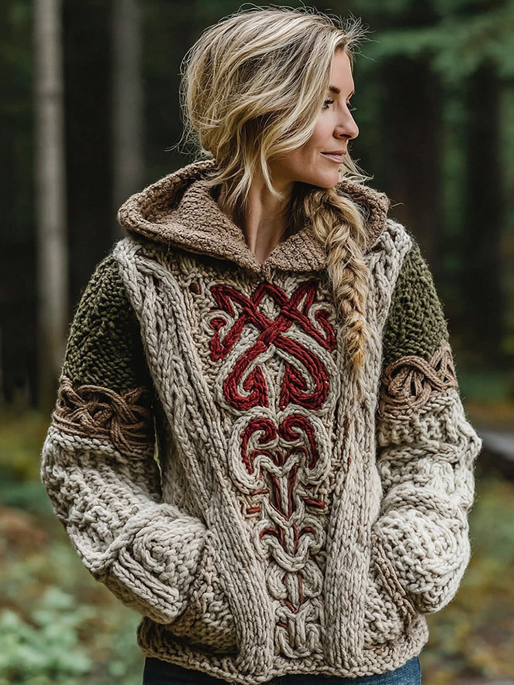 Women's Celtic Knot Irish Jacquard Contrast Print Knit Hoodie