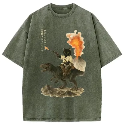 Cat Riding A Dinosaur Washed T-shirt