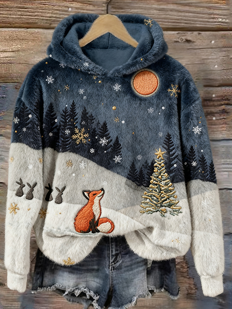 Forest Snow Fox Christmas Tree Plush Hooded Sweater