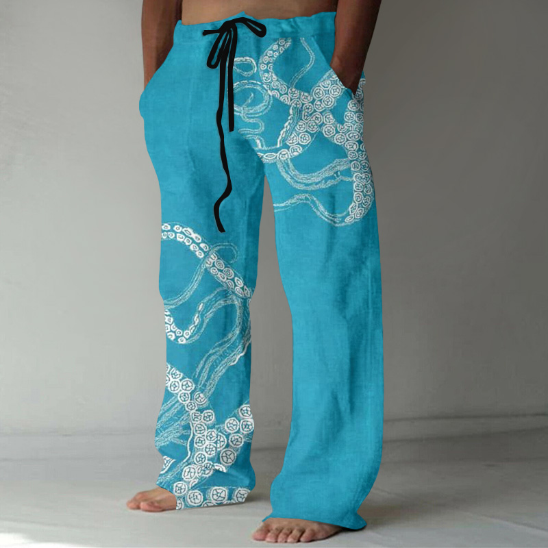 Japanese Art Octopus Print Casual Linen Blend Pants