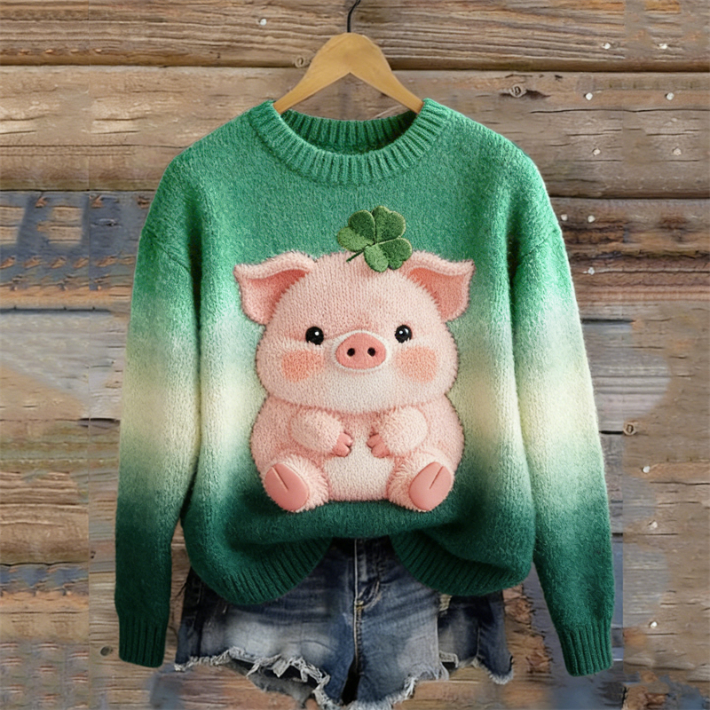 Lovely Shamrock Pig Gradient Color Cozy Knit Sweater