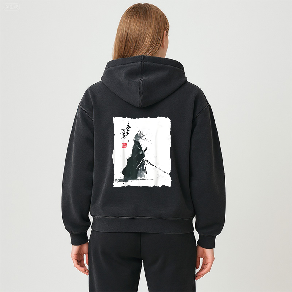 Samurai Cat Ink Art Japanese Washed Zip Hoodie