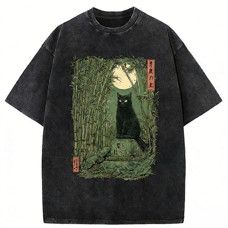 Vintage Black Cat Samurai Riding A Dragon Art Print Casual Cotton Shirt