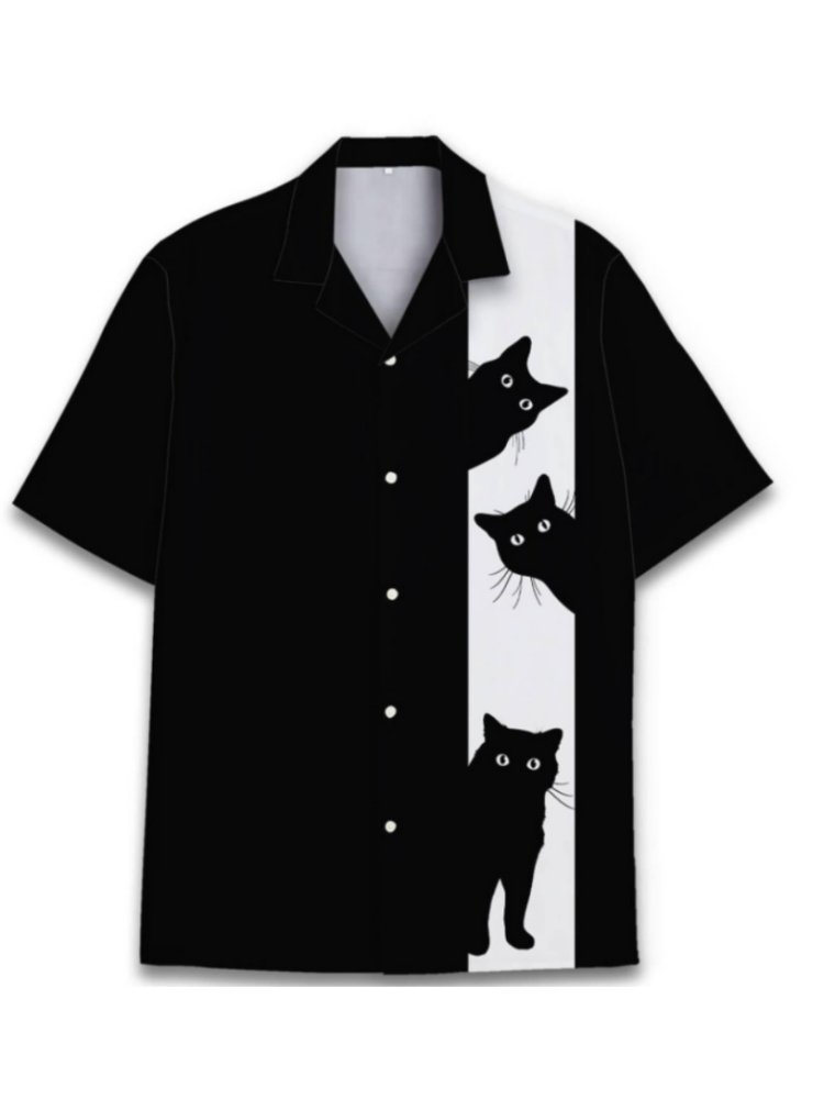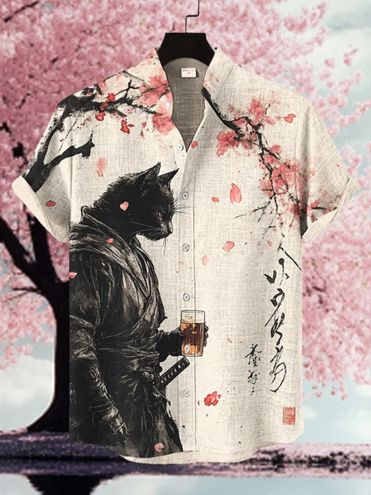 Men's Black Cat Warrior Under The Cherry Tree Art Print Casual Shirt