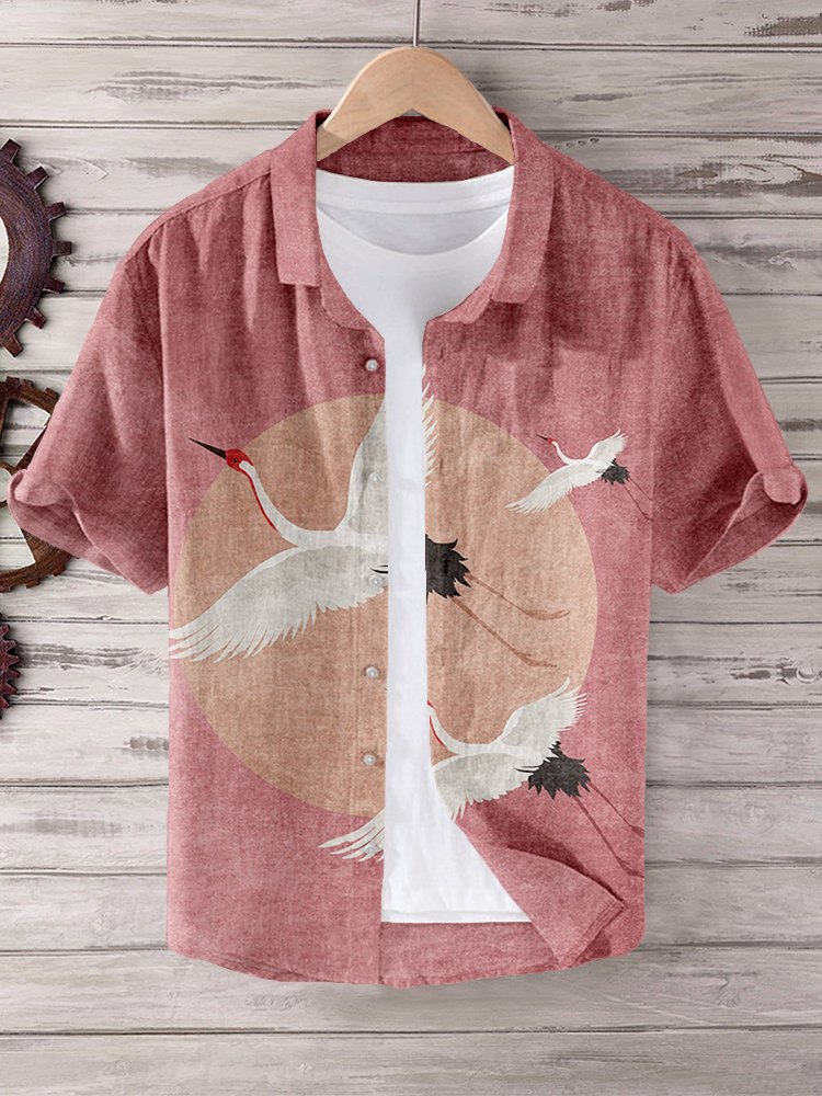 Japanese Crane Formation Pattern Linen Blend Shirt