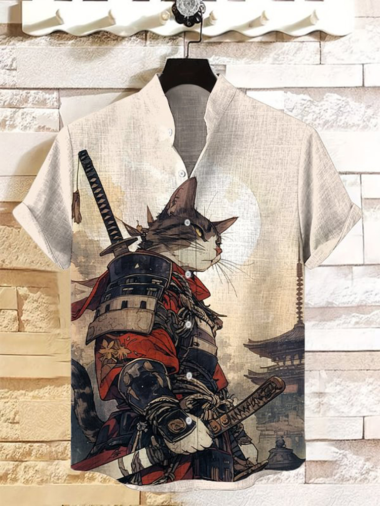 Men's Cat Warrior Guard With Knife Art Print Linen Blend Shirt