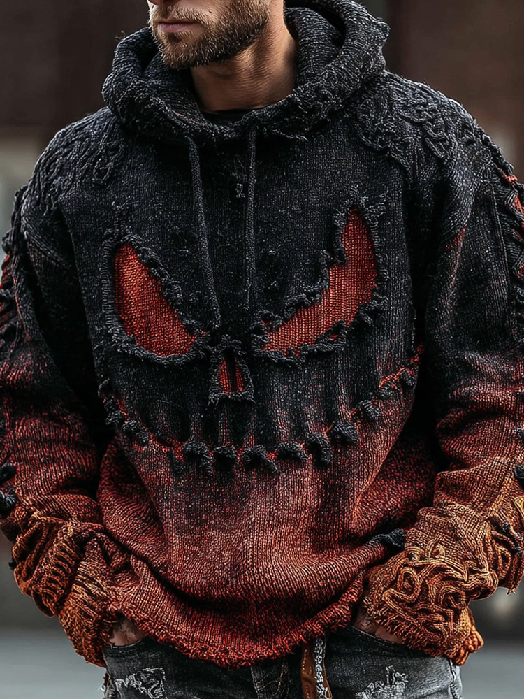 Men's Halloween Spooky Face Gradient Inspired Knitted Distressed Hooded Sweater