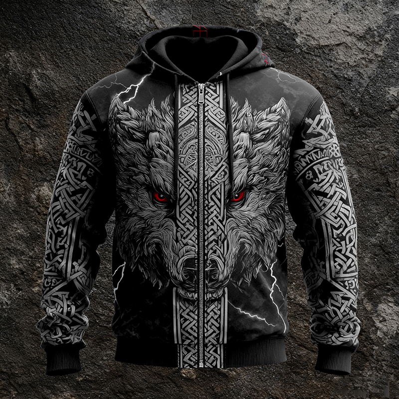 Men's Viking Lightning Wolf Runes Vegvisir Vintage Full Zip Hoodie