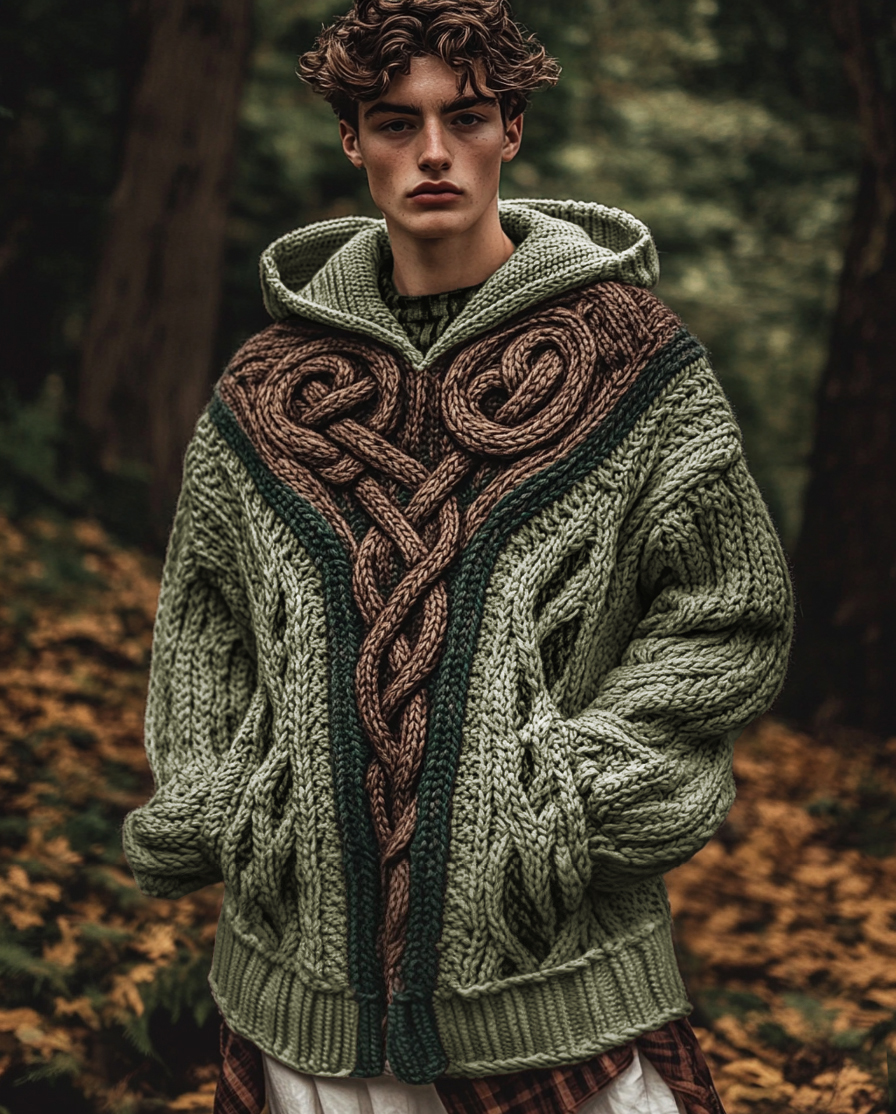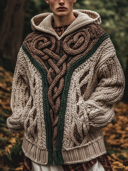 Men's Vintage Irish Celtic Knot Jacquard Mottled Hooded Sweater