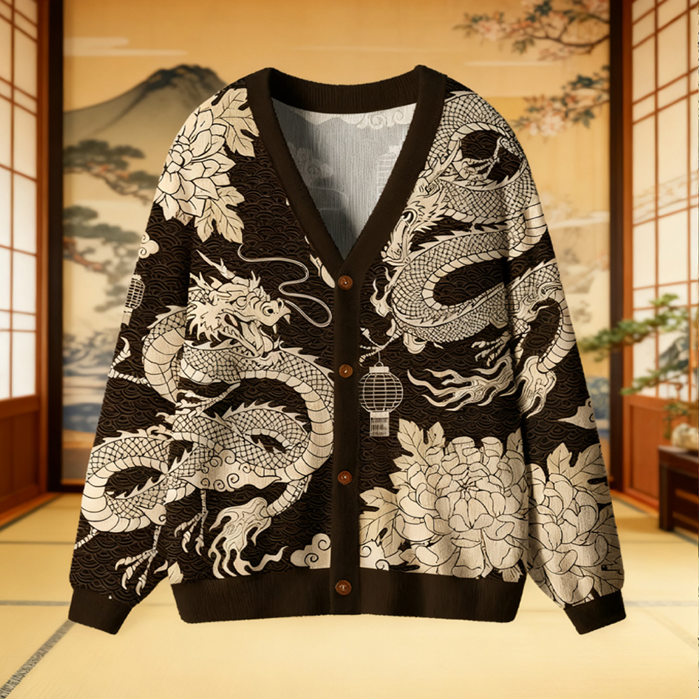 Two Dragons Playing With A Pearl Ugly Cardigan Sweater