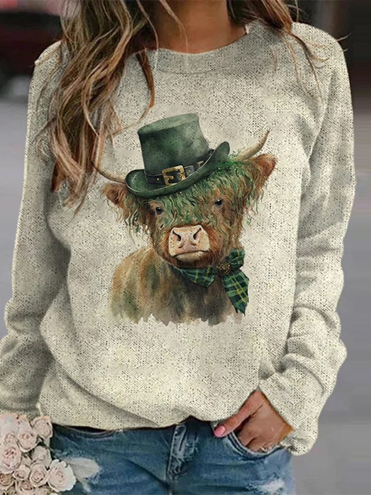 Women's St. Patrick's Day Pattern Trefoil Highland Cow Print Sweatshirt