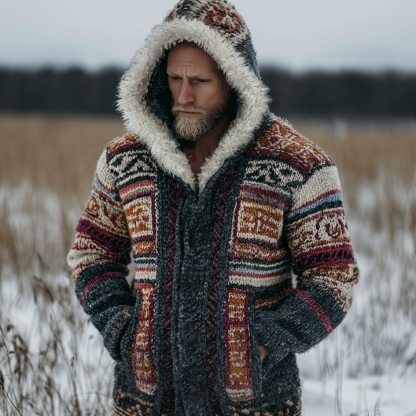 Japanese Art Retro Geometric Design Men's Hooded Knit Sweater Jacket