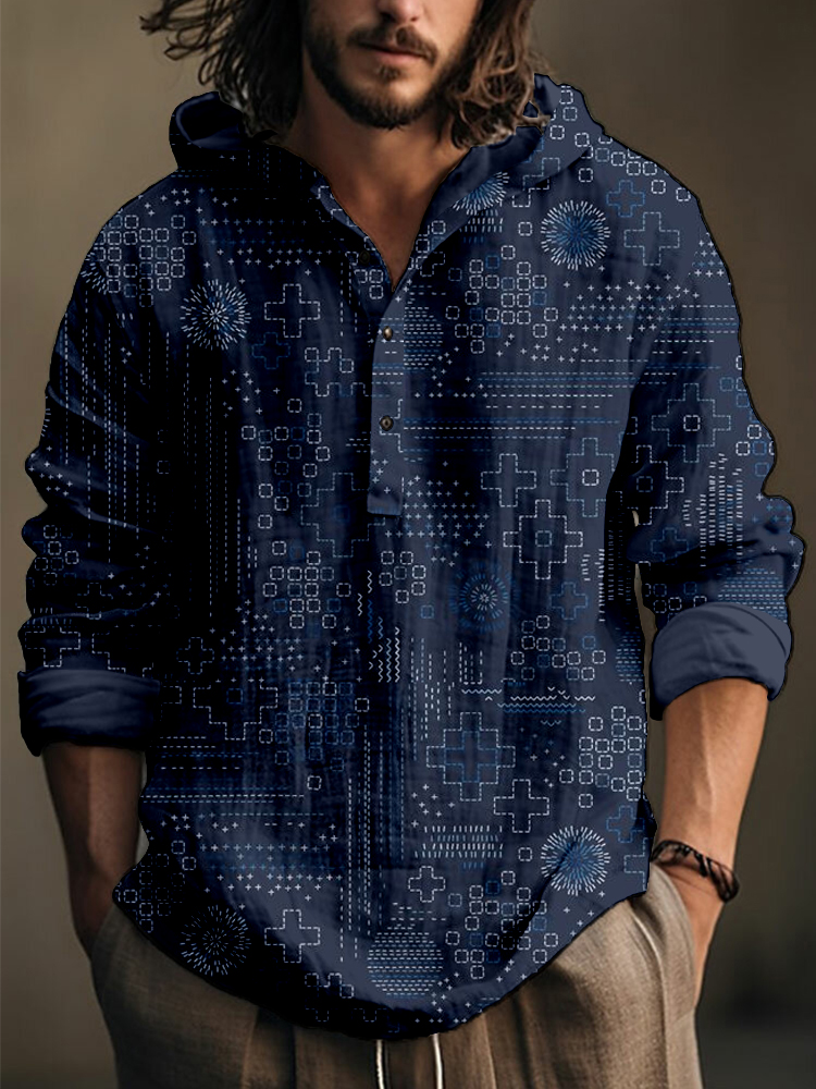 Japanese Traditional Pattern Linen Blend Hooded Shirt